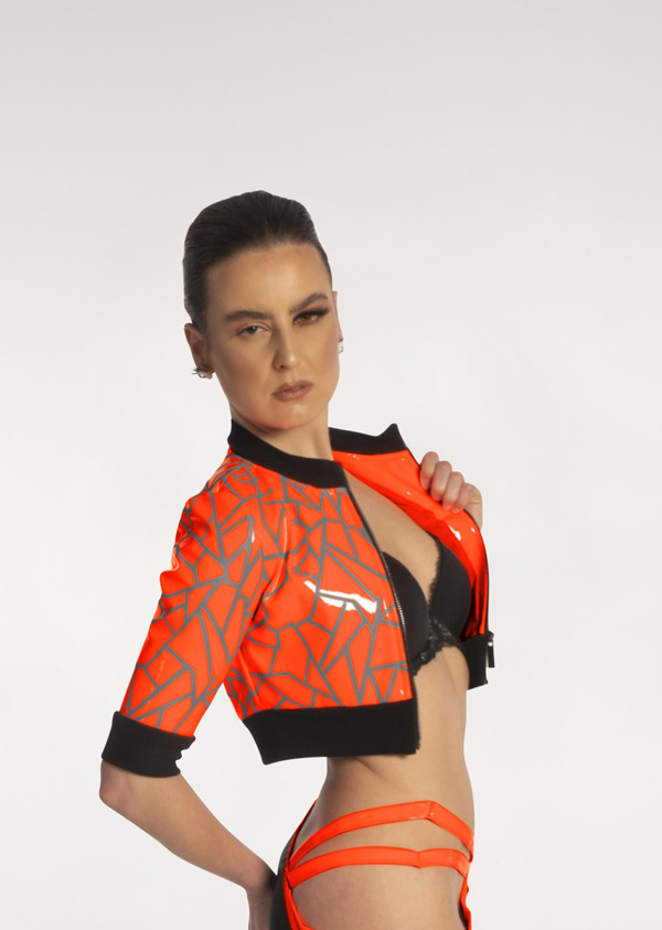 This bomber jacket is cropped and made of glossy neon orange vinyl. There are reflective silver lines on this jacket. Unique to this design is that it reflects.