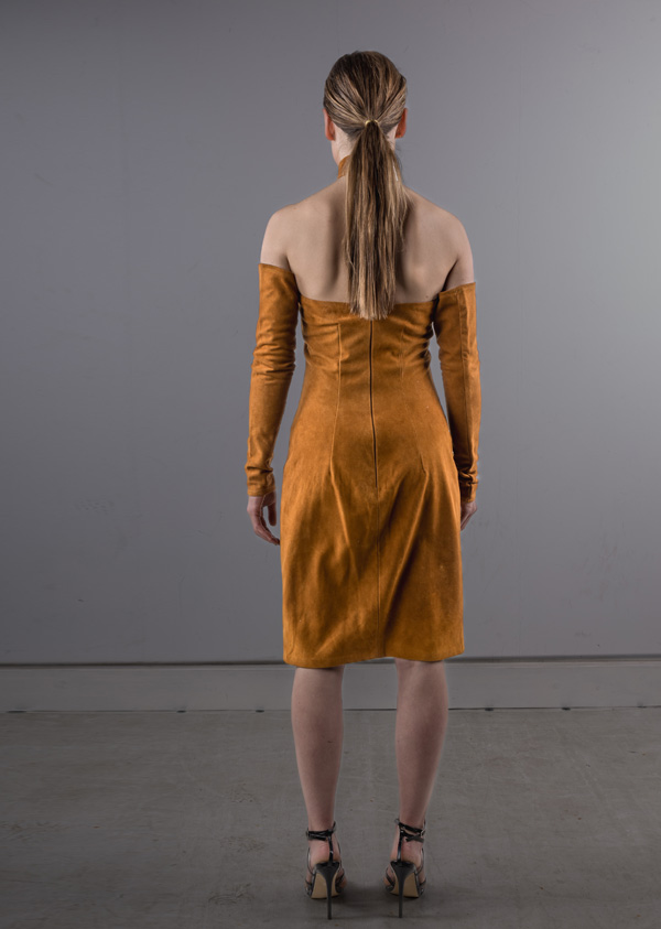 This strapless mini dress has a split at the front. The sleeves are loose so that the dress can also be worn without. The dress has a halter and has hooks and eyes closures at the back.