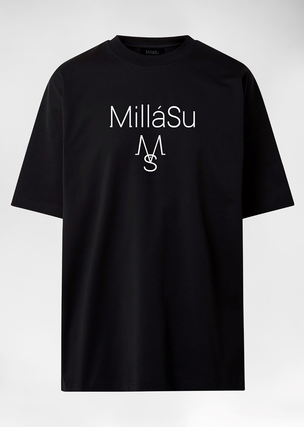 This black t-shirt is made from cotton-jersey and has a loose, oversized fit. It features in white the brand name MilláSu with the logo in bold lettering at the front.