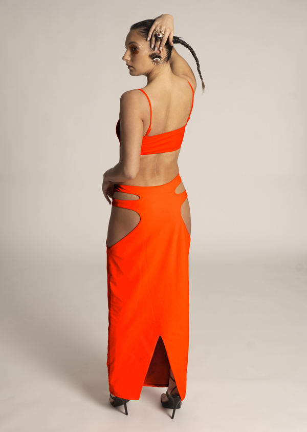 The neon orange cropped top is made from stretch jersey fabric. This sensual strappy design has 3 eye accessories on the right strap. What is so unique about these eyes is that they have 3D eyelashes. Unique to this design is that it reflects.
