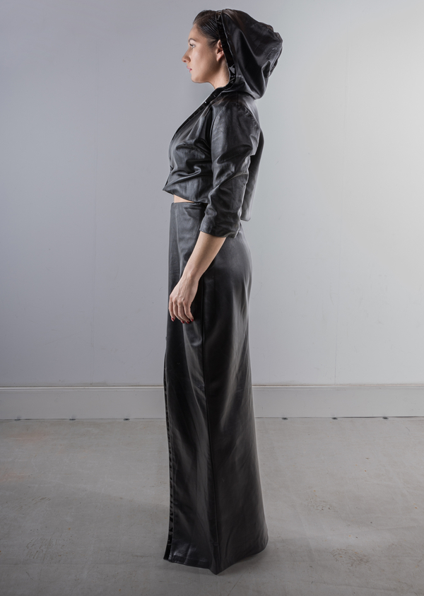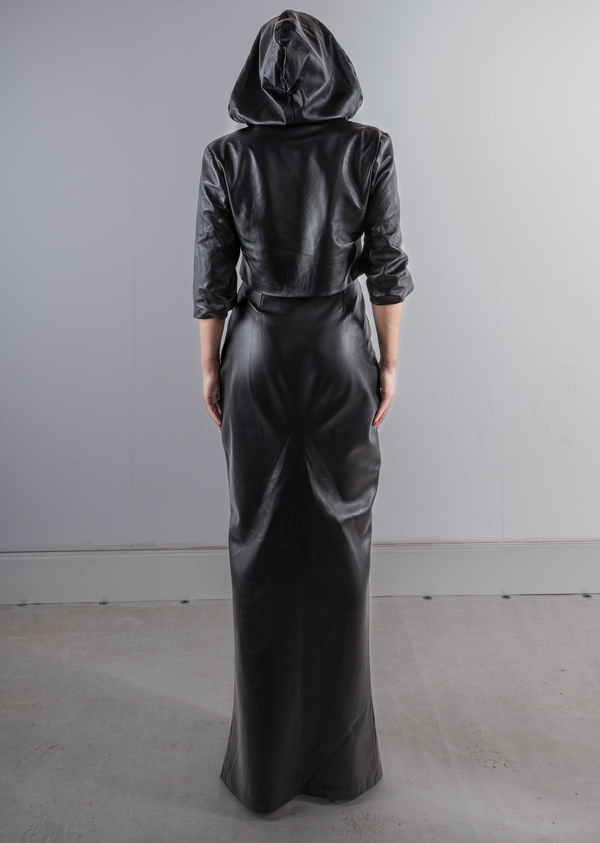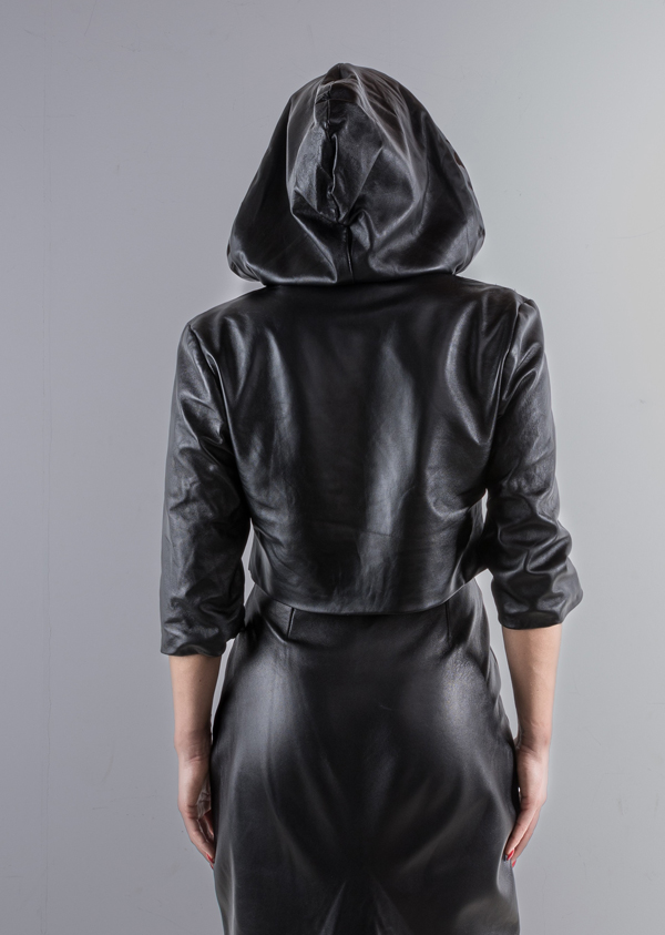 This jacket with hoodie is made of supple leather. It closes with hooks and eyes at the front. At the edges of the hoodie, which can be seen throughout the jacket, it is made of patent nappa leather, which takes the jacket to another level.
