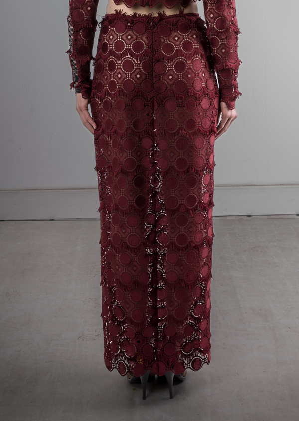 This long skirt with split at the back is made of embroidery lace and has leather strips on the sides. It has a visible zipper at the back.