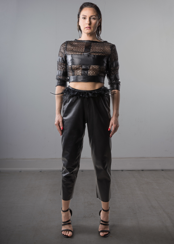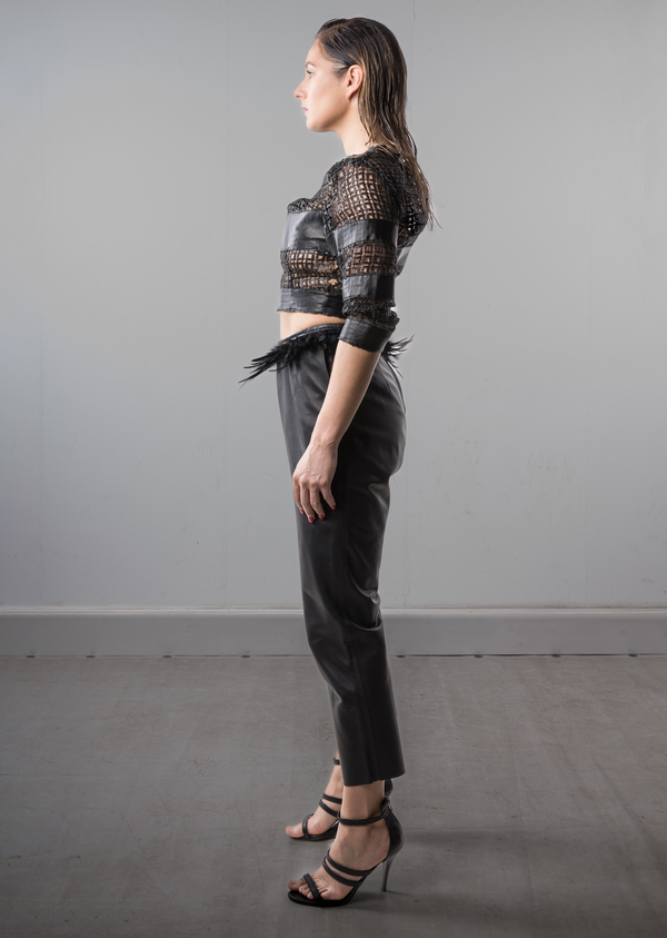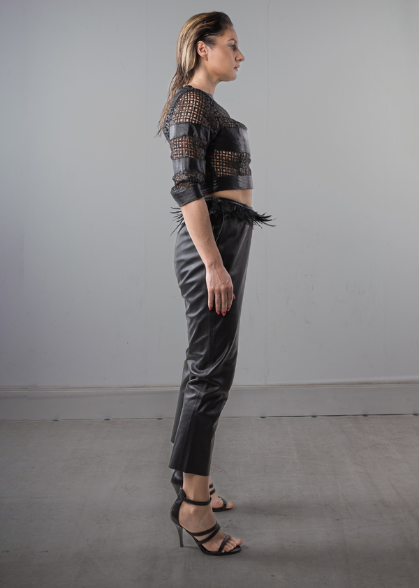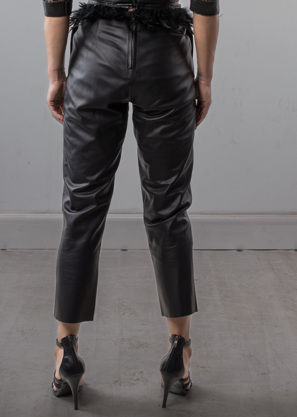 These three quarter pants are embellished with supple nappa leather. It has a turkey feather belt and a zipper on the back.